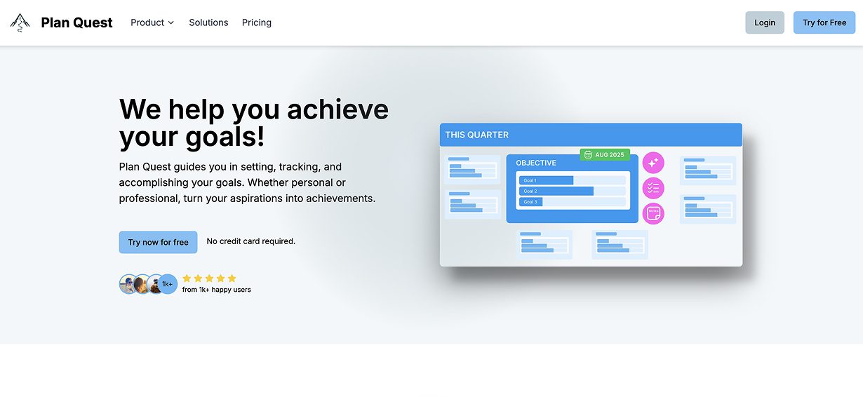 Plans quest is an AI powered goal setting and achievement platform that transforms personal and professional aspirations into structured, actionable plans with visual timelines and progress tracking capabilities. It eliminates the complexity of traditional goal management by automatically generating detailed roadmaps from simple goal descriptions and providing comprehensive tools for monitoring progress, adapting strategies, and reflecting on achievements throughout the journey.